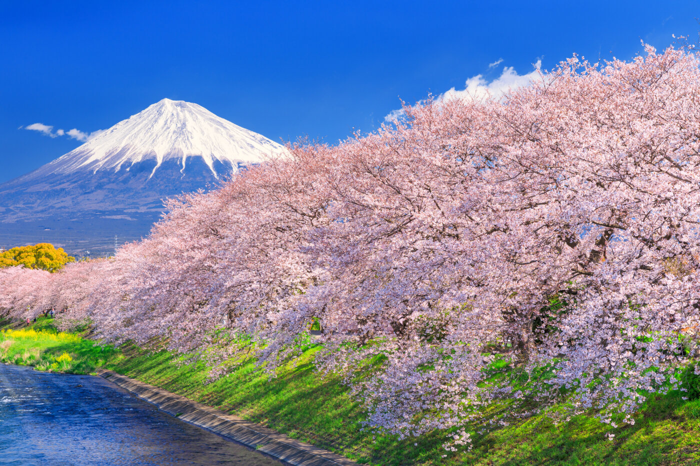潤井川(うるいがわ)沿い約250mに渡って咲き誇る見事なソメイヨシノと、背景には残雪の富士山が望める絶景スポット。絵画のような一枚が撮影できます。