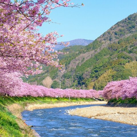 伊豆半島最南端、南伊豆町を流れる青野川沿い2kmの両岸に、800本の河津桜が植えられています。2月に菜の...