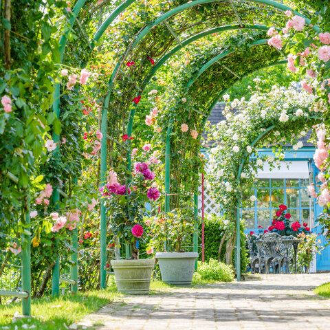 20万坪の敷地に13のテーマガーデン。600種4,000株のバラ、ハーブ、季節の花々が楽しめる。