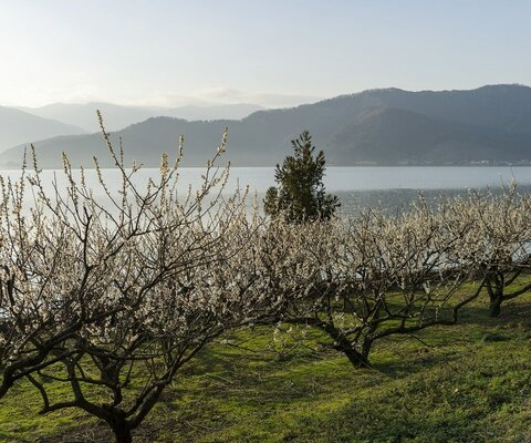 三方五湖西岸湖畔に7万本の梅が栽培されています。品種は、梅干し用の「紅映(べにえ)」と、梅酒に使わ...