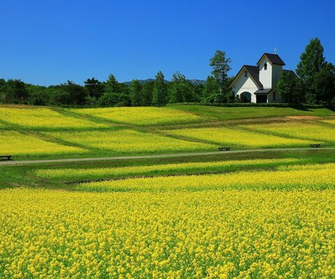 春は菜の花、夏はひまわり、秋はコスモスが楽しめます。近くには蕎麦畑もあります。近年はネモフィラも...