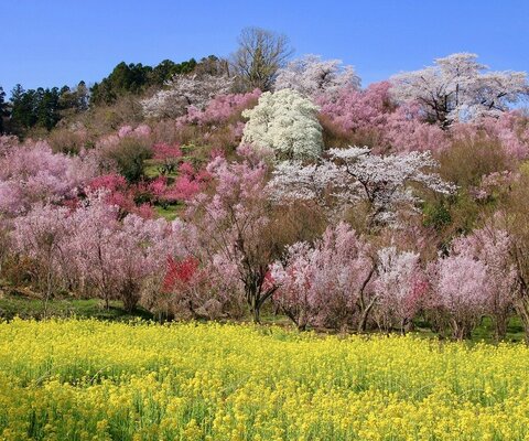 春は菜の花と約1000本のソメイヨシノが1kmにわたって咲き誇る桜の名所です。6月には100種1万株といわれ...