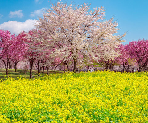 角田山(かくだやま、標高481m)を背景に、四季折々の花が咲きます。春は桜と菜の花が広がり、夏にはか...