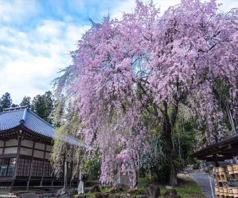 約60本のクマガイザクラが咲き誇るお寺。早咲きの桜なので例年3月中旬が見頃。駐車場有り。