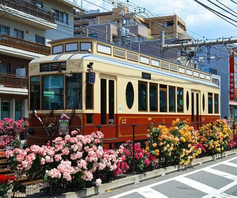 東京に唯一残る都電です。荒川区内の沿線4kmに、140種、13,000株のバラが植えられています。三ノ輪橋停...