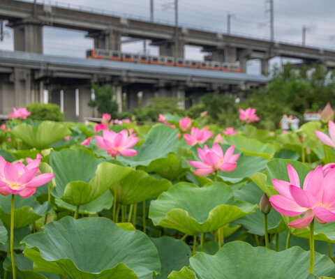 埼玉新都市交通ニューシャトルを背景に蓮を撮ることができます。 駐車場はありませんが、沼の前の道に...