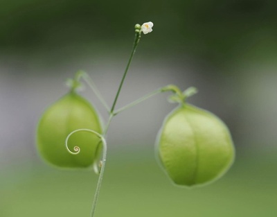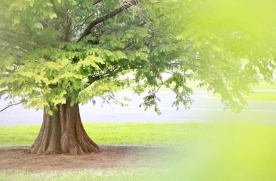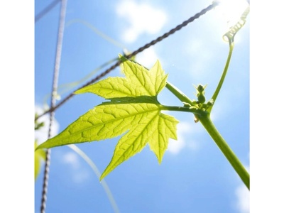 こちらは、インスタ映え講座で前ボケの練習用に撮影した1枚。花みどり文化センターの前にあるゴーヤの葉っぱを前ボケに、後ろに立つ木を撮影しました。