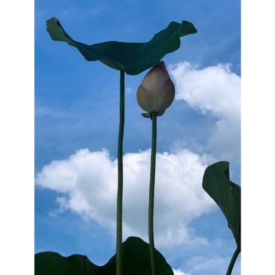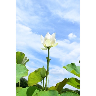 蓮の葉と蕾が空高く、雲よりももっと上までまっすぐ伸びていくかのように撮影した1枚です。空の色に露出を合わせて夏らしい空を表現し、伸びている様子に目が行くように蓮は暗めに撮りました。