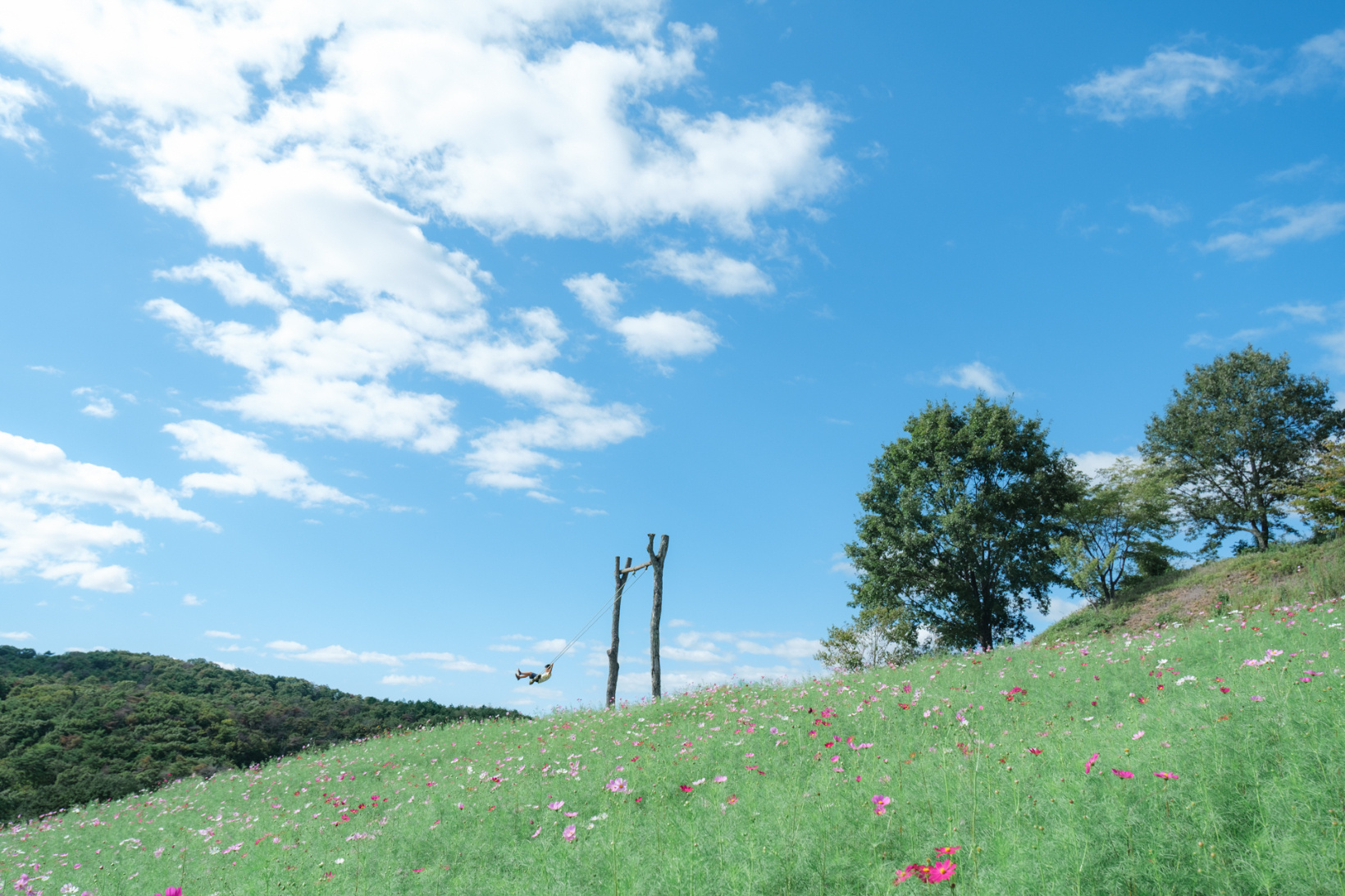 ブランコの周囲には季節の大きなお花畑が出現しますが、秋はもちろんコスモスです。