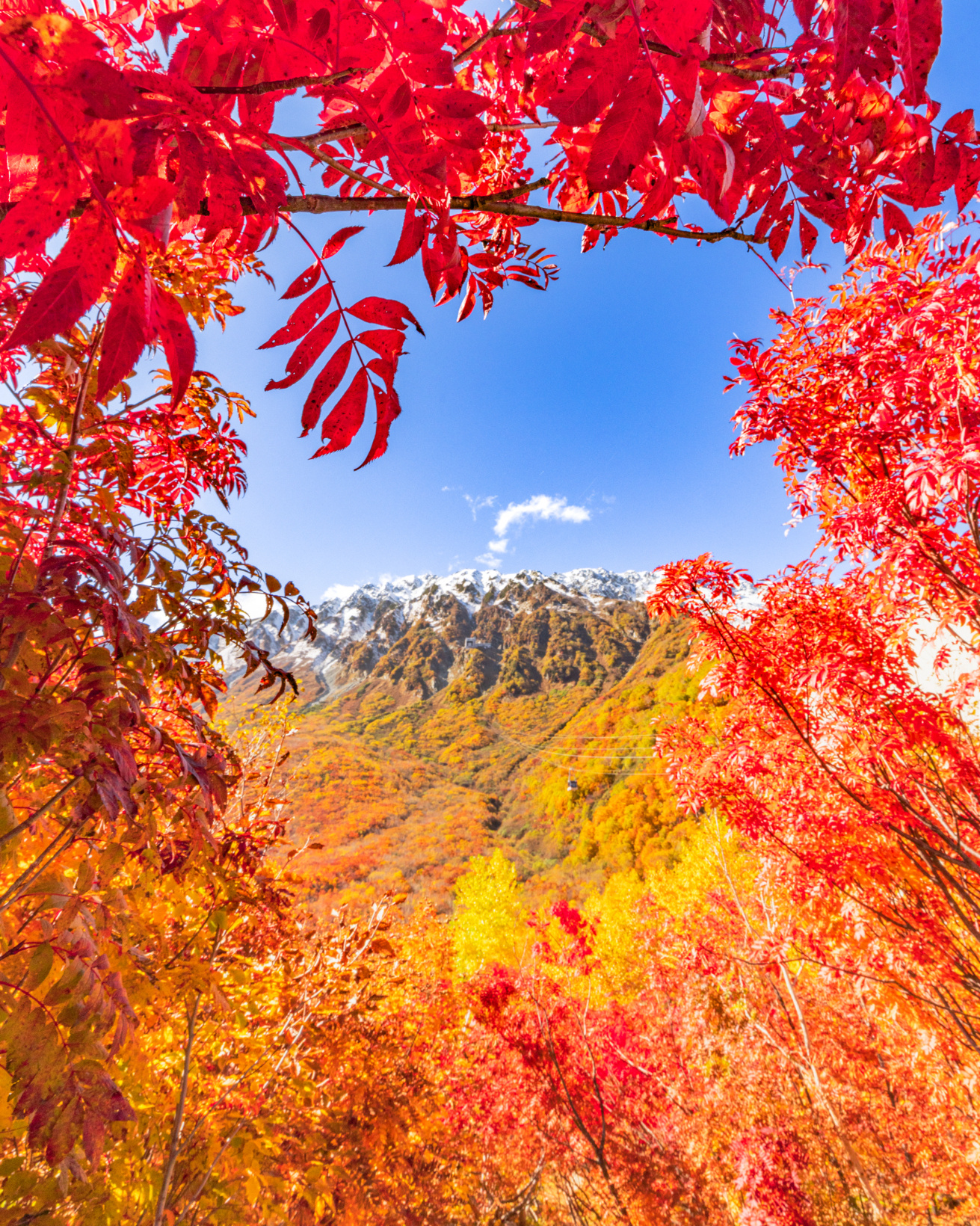 真っ赤に染まった紅葉の葉を額縁に見立て、奥に見える雪山とのコントラストを際立たせるために撮影しました。