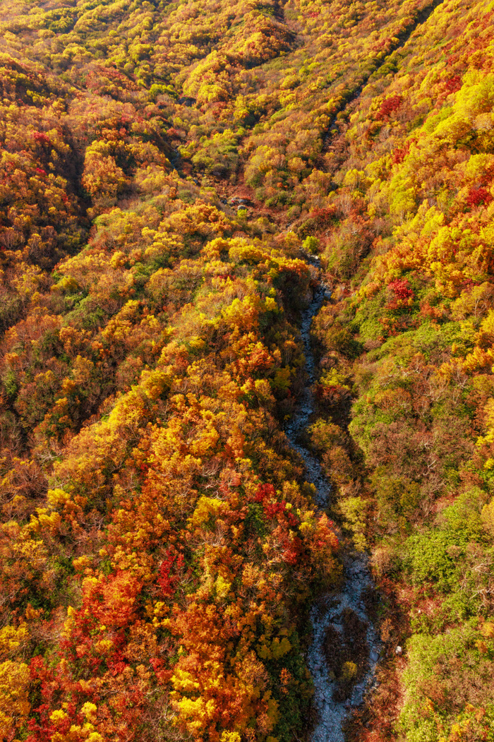 特に、この写真は24-70mmの標準レンズを24mmに設定し、渓谷を流れる清流と周囲を取り囲む紅葉のコントラストを際立たせて撮影しました。