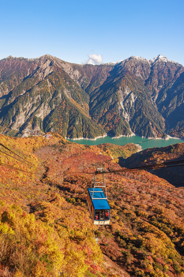 眼下には黒部ダムの青い水面が輝き、その周囲を黄色や赤に色づいた紅葉が取り囲んでいました。