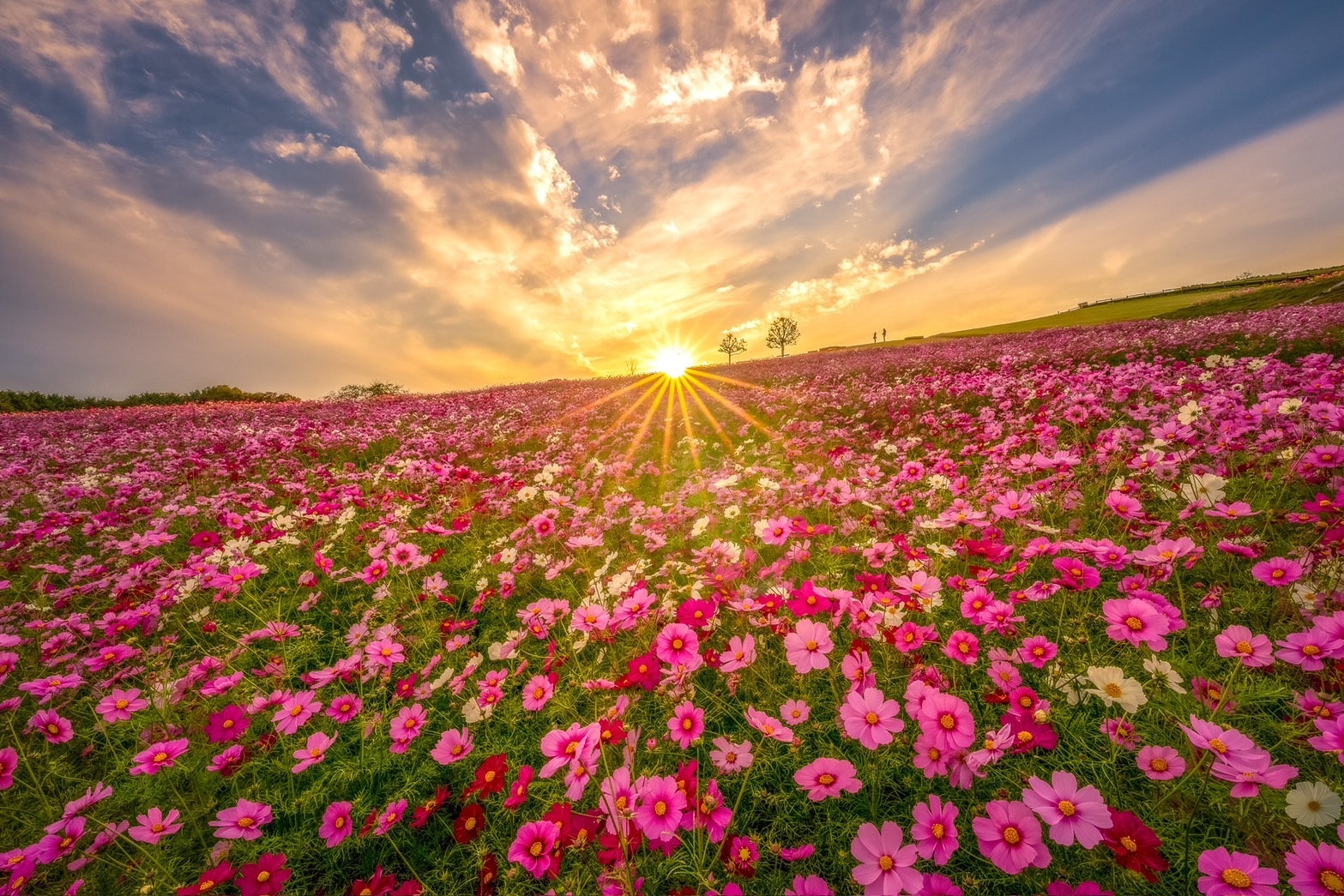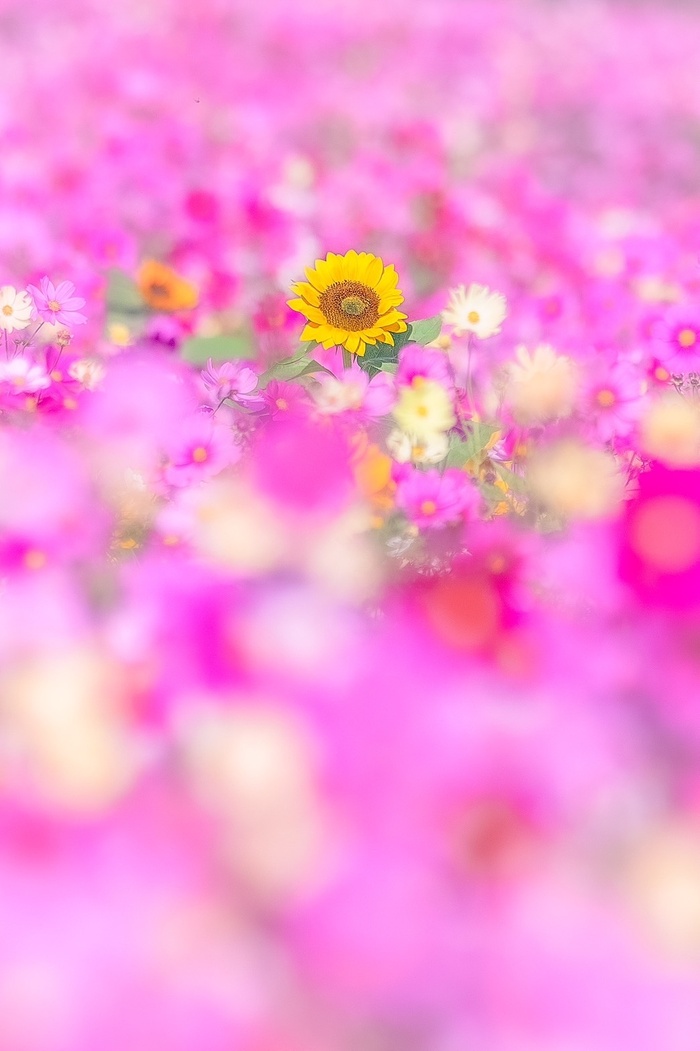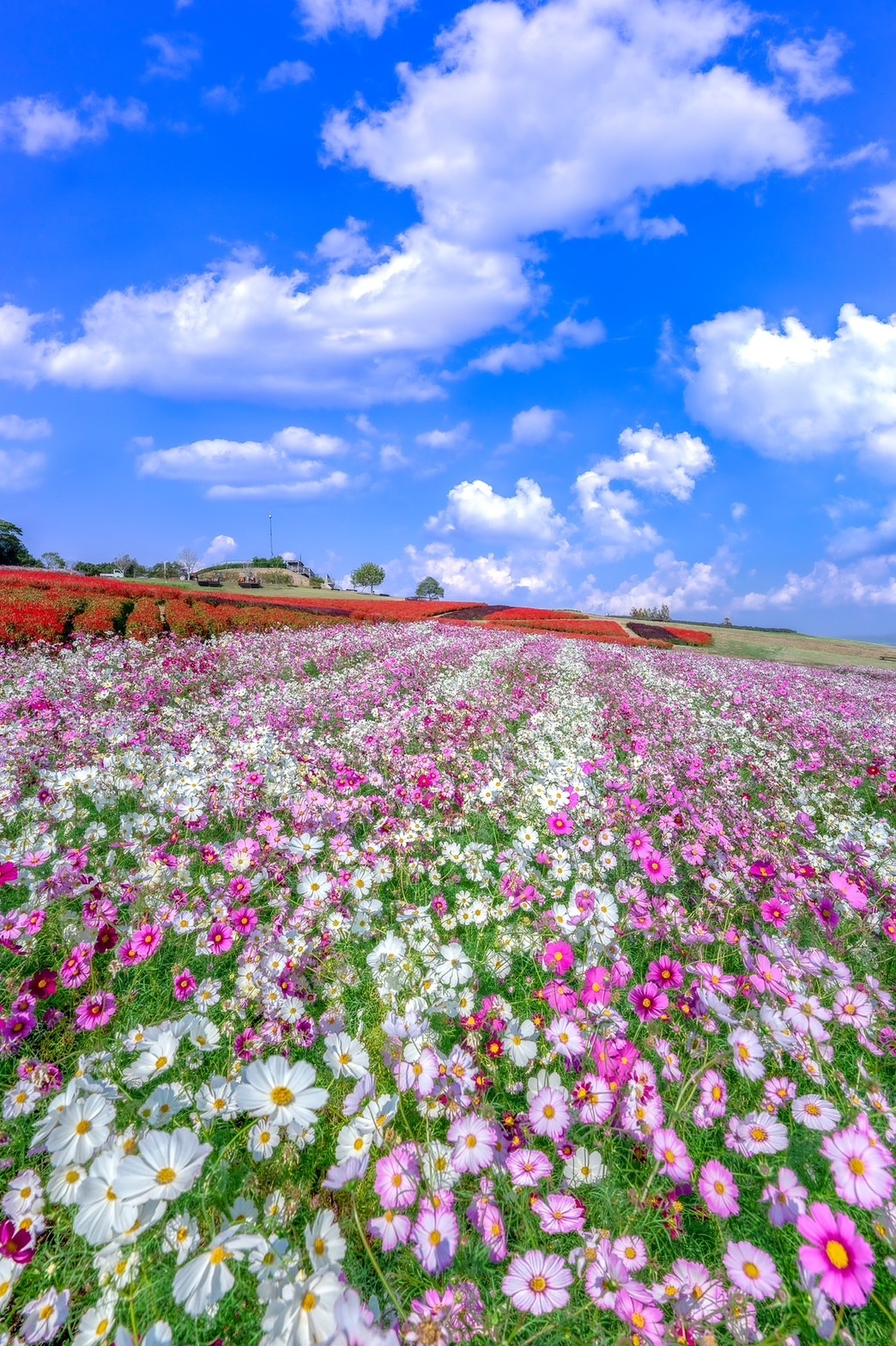 広角レンズを使用することで、コスモスの絨毯が永遠に続くかのようなダイナミックな花風景を表現しました。