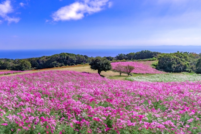青い空と海を背景に、太陽を浴びて輝くコスモスの絨毯がとても美しかったです。