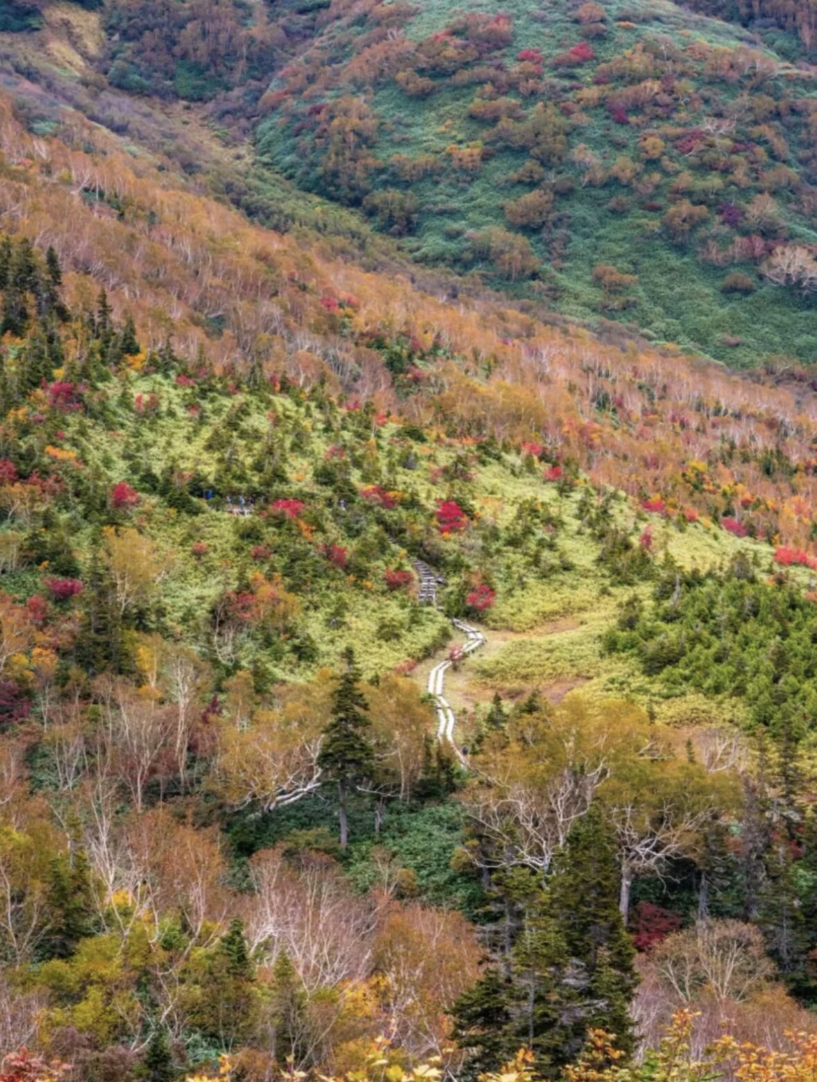 その後しばらく歩くとアップダウンが大きくなり、木道以外の山道を歩く部分もあるので、動きやすい服装に滑りにくい靴で…。