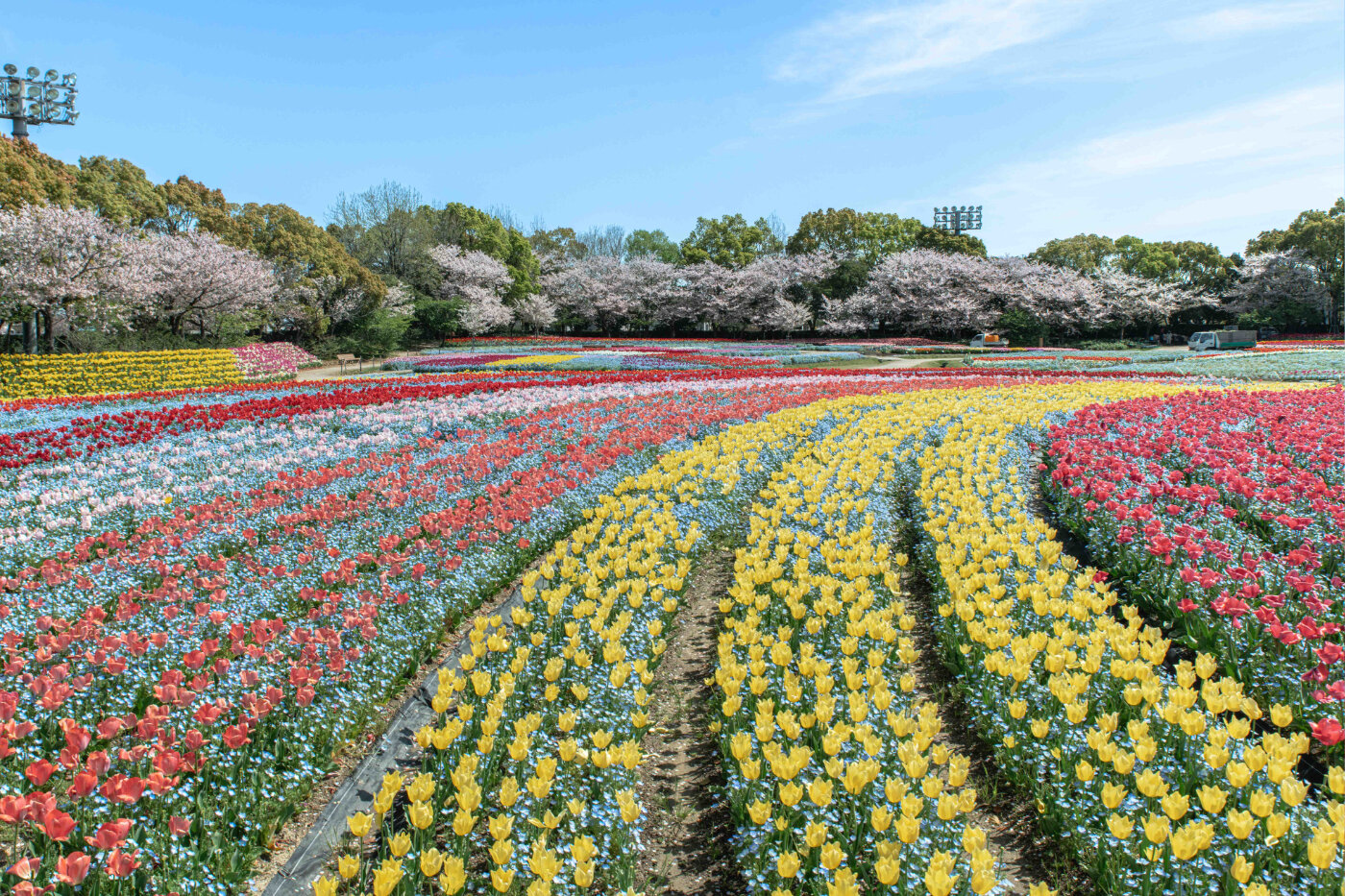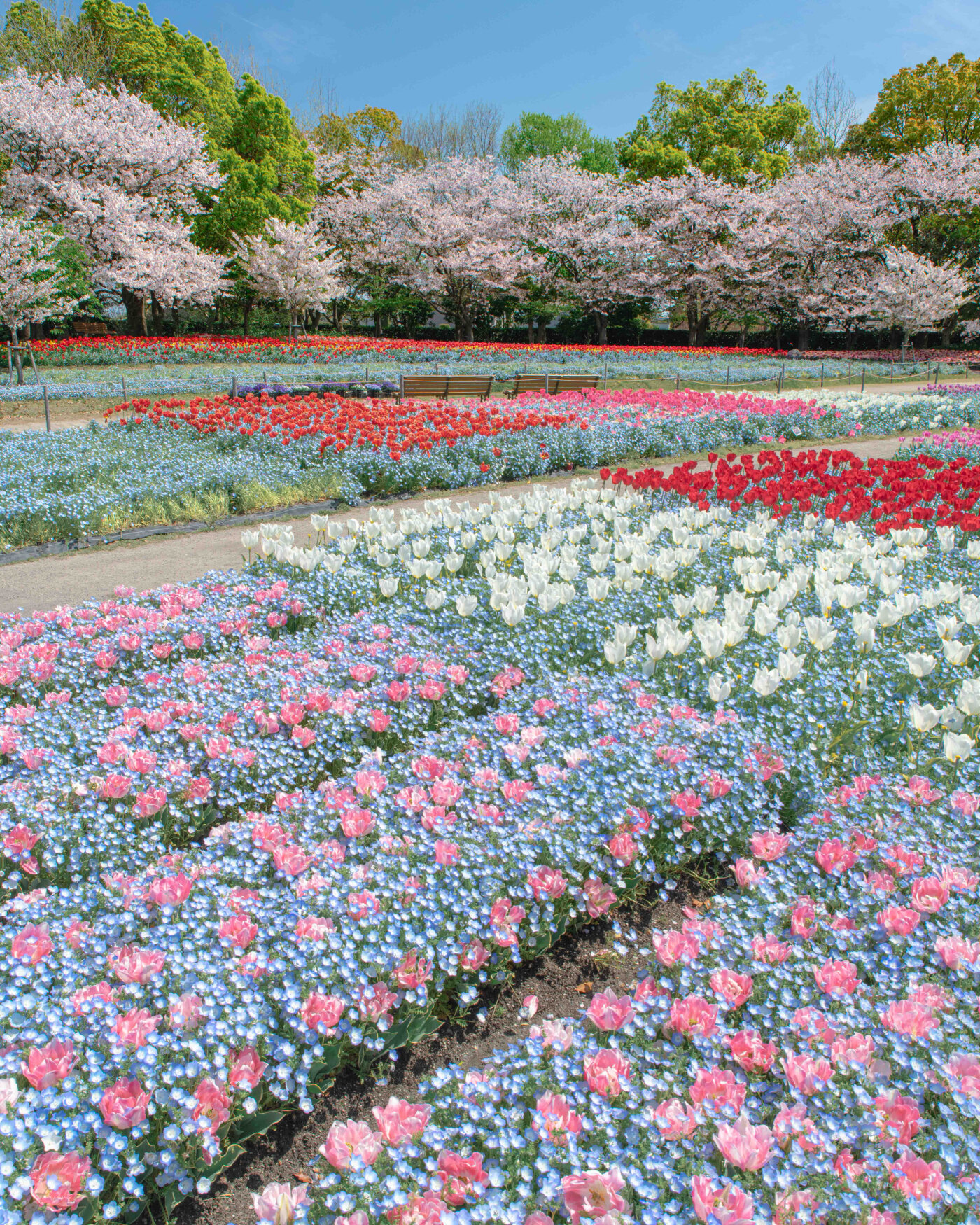 チューリップも終盤に差し掛かる頃には次の花まつりであるネモフィラが咲き始め、花持ちの良い部分ではチューリップとネモフィラのコラボレーションも見ることができます。(ネモフィラ祭りは例年4月中旬~5月中旬に開催)私のお気に入りの時期はネモフィラとの競演が見れる4月中旬頃でネモフィラの爽やかな青色にチューリップの鮮やかな色が映えてとても綺麗です。