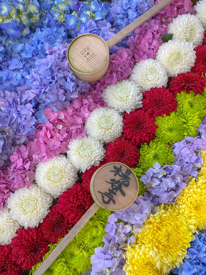 特に人気があるのが、花手水です。山門を入ってすぐの花手水には、色とりどりの紫陽花が浮かび、訪れた瞬間から華やかな気分に包まれます。境内には他にも数ヶ所の花手水があり、それぞれ異なる趣の美しさを楽しめます。
