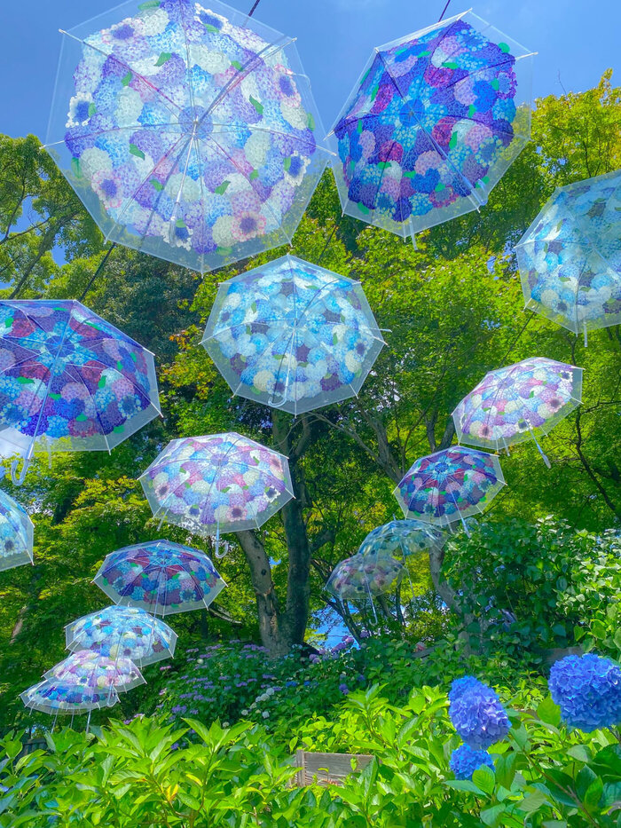 さらに、参道の上には紫陽花柄の傘が吊るされた「アンブレラスカイ」も現れ、カラフルなアンブレラが、境内をより一層華やかに彩ります。