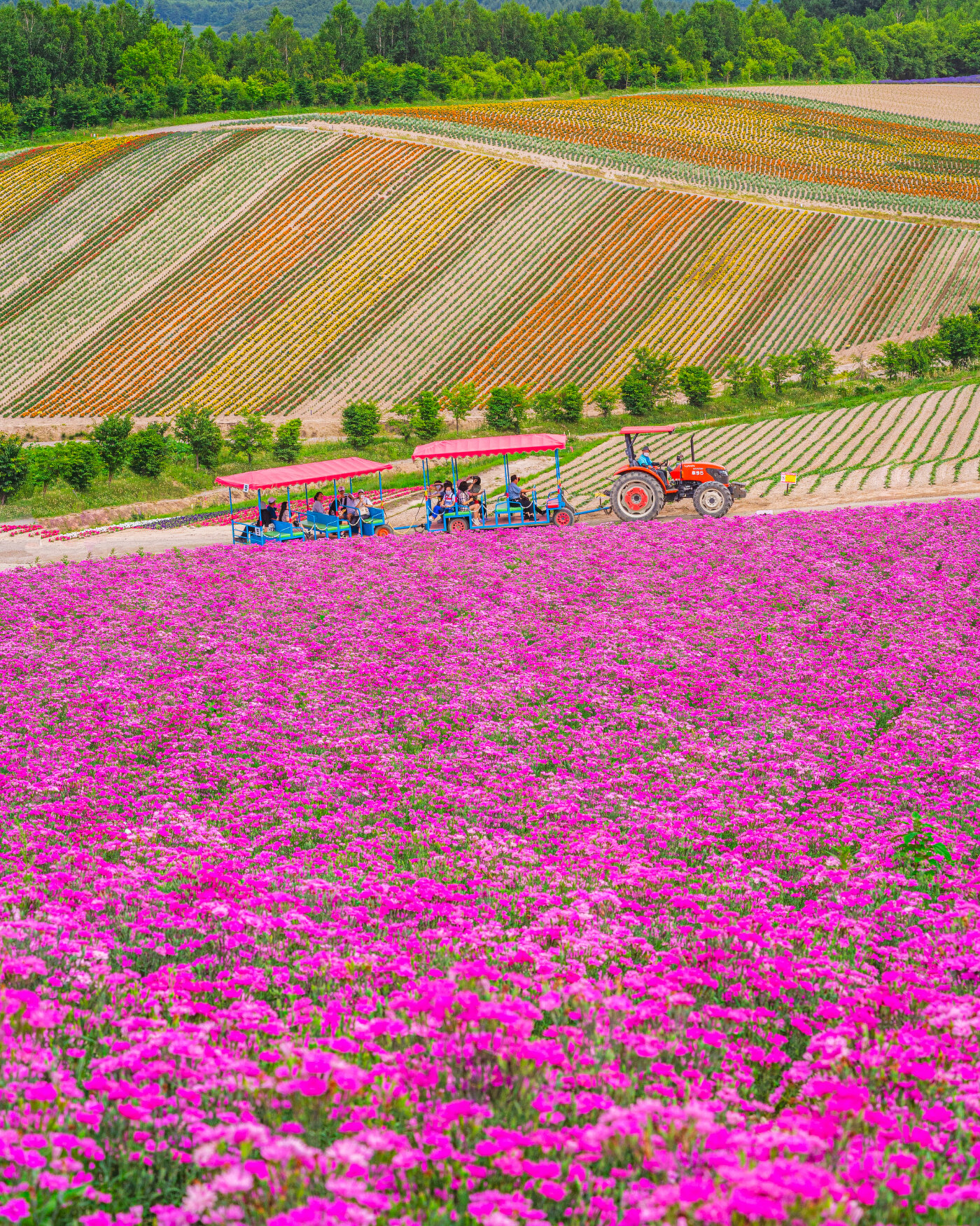 丘の上から眺めると、赤・黄・紫・ピンクと、まるで虹色のカーペットが広がっているかのような絶景をご覧いただけます。