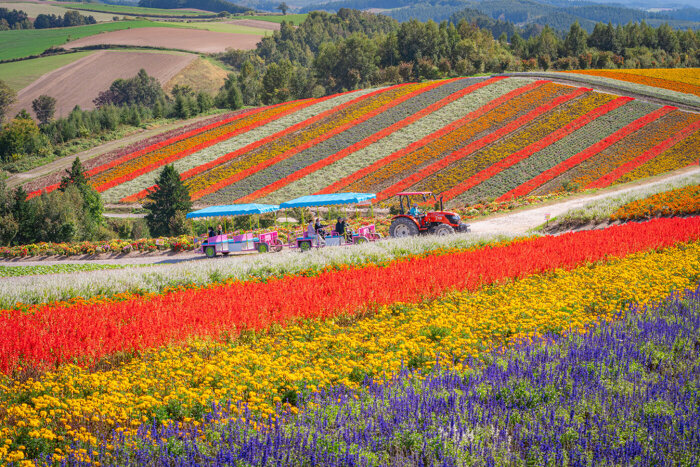 北海道・美瑛町にある四季彩の丘では、春から秋にかけて、色とりどりの花畑が訪れる人々を魅了します。
