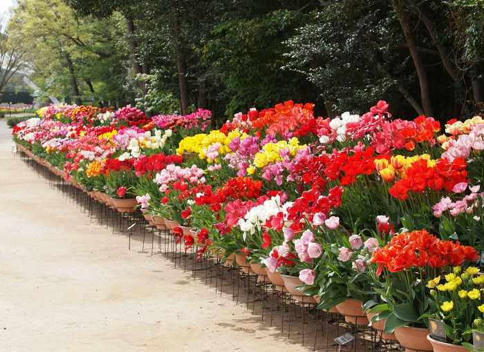 ユリ咲き、八重咲き、フリンジ咲きなどさまざまな品種のチューリップを約250鉢、友愛の道で展示します。原種や珍しい希少品種も並びます。
